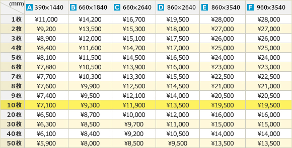 D:860×2640mm E:860×3540mm F:960×3540mm (仕上がりサイズ)